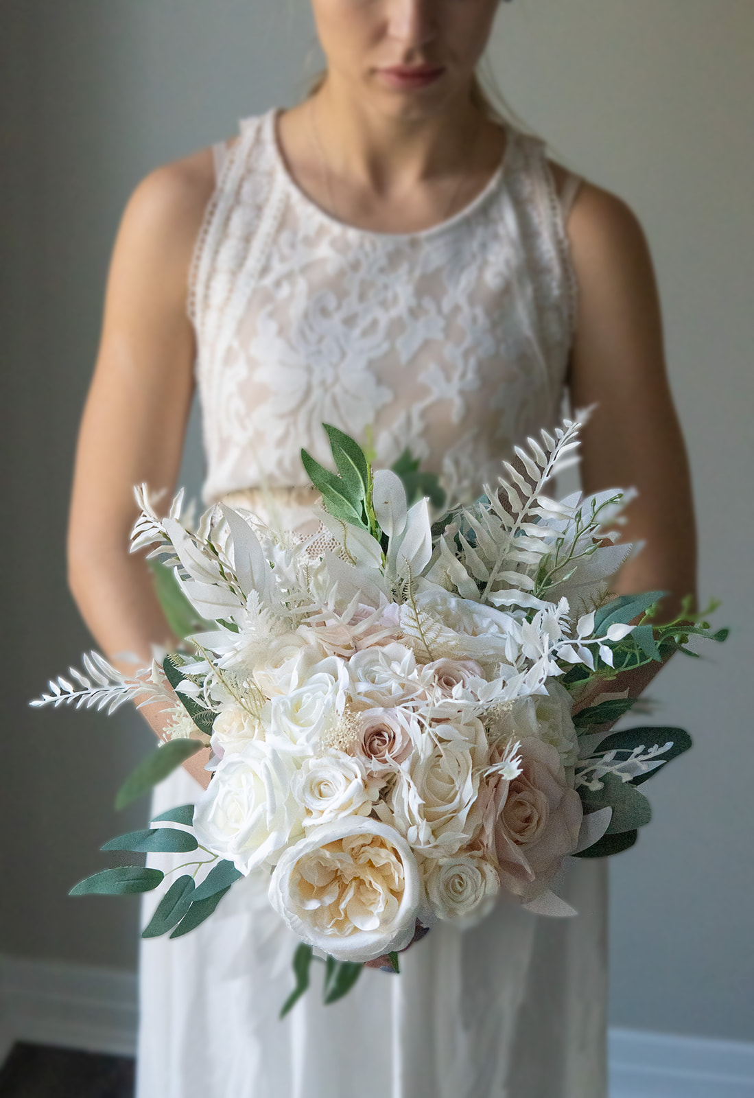 Size of this bridesmaids bouquet is about 12" in diameter. Each bouquet is made of high quality silk and real touch artificial flowers. Stem is wrapped in ivory satin ribbon.