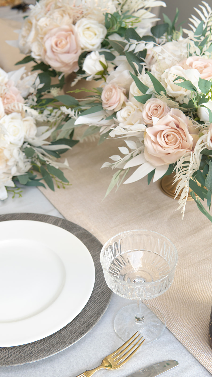 Size of this centrepiece is about 14" by 10" overall size. Metal gold vase comes with each centrepiece. Materials used are mostly silk artificial flowers with some real touch details and accents.