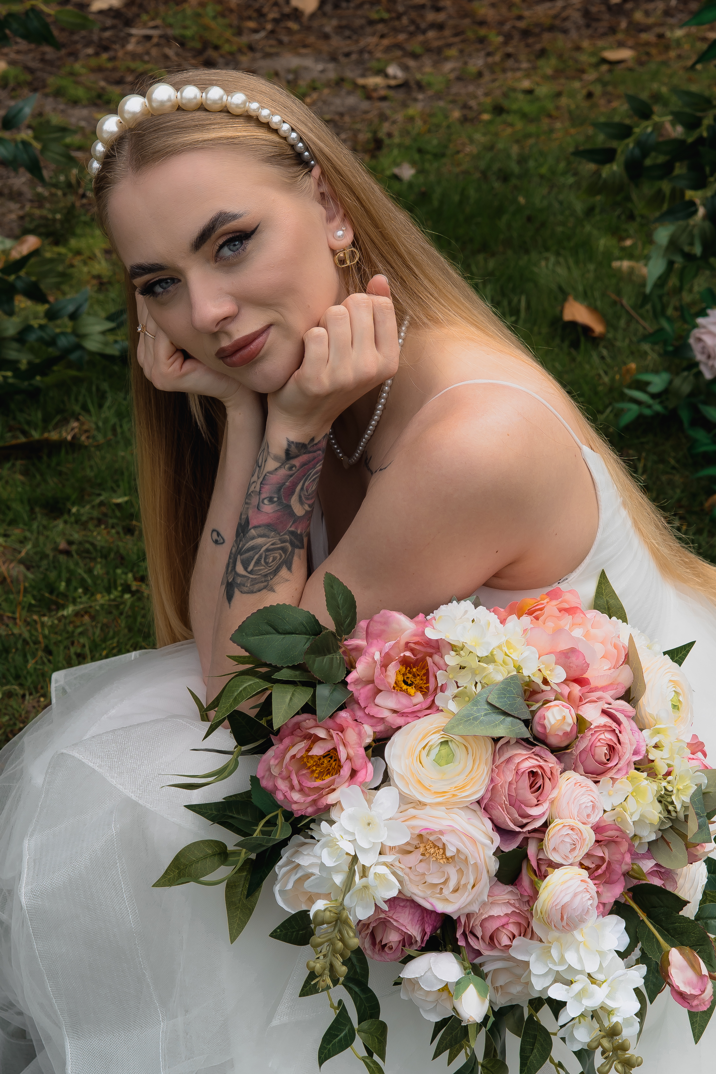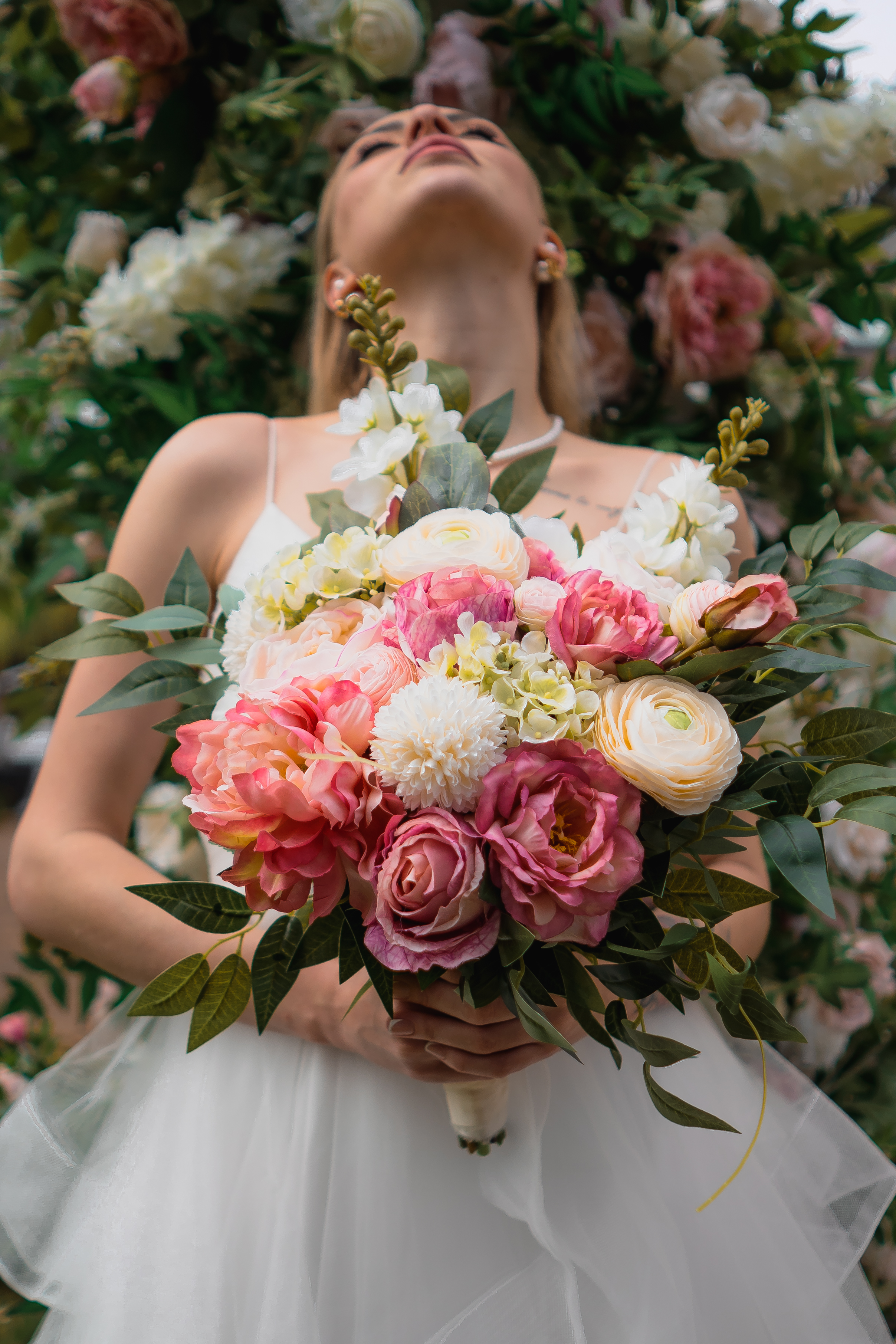 This bridal bouquet is about 16-17" in diameter. Ribbon for wrapping is ivory. Any additional matching decor can be made per request.