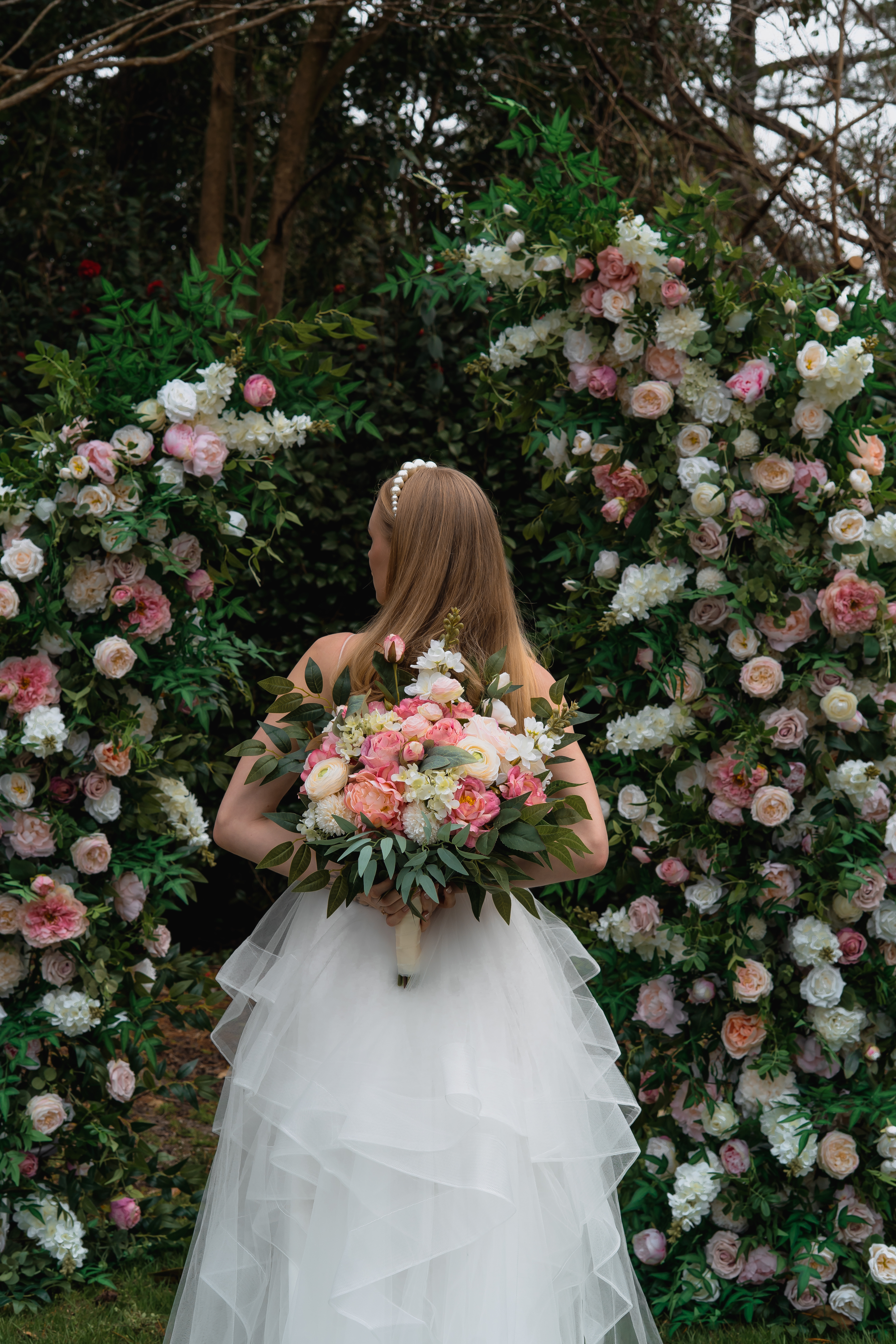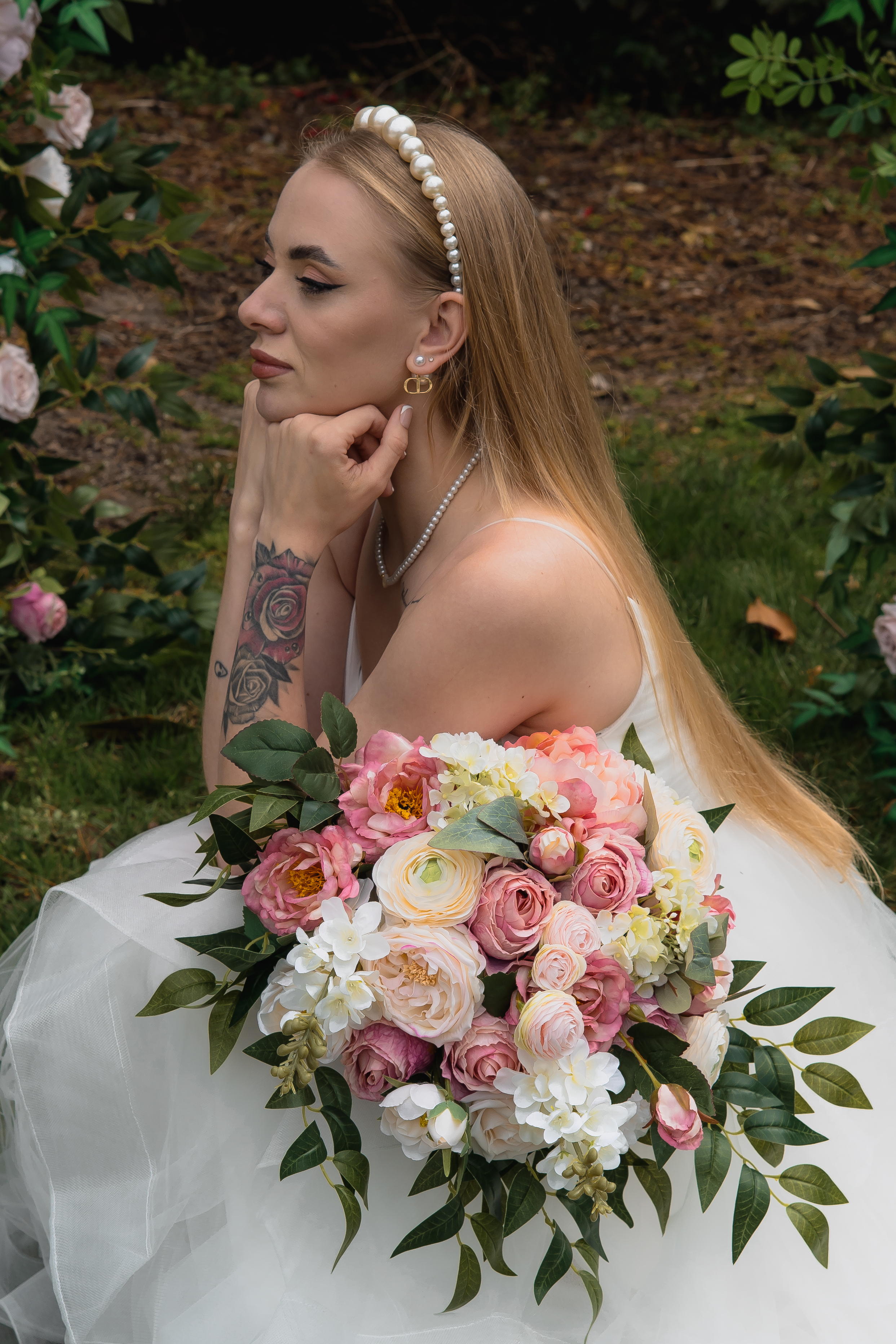 Size of this bouquet is 12" in diameter. Stem wrapped in ivory ribbon.